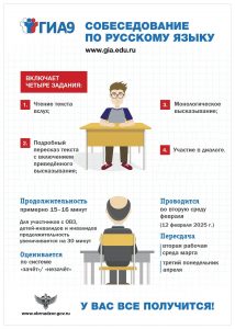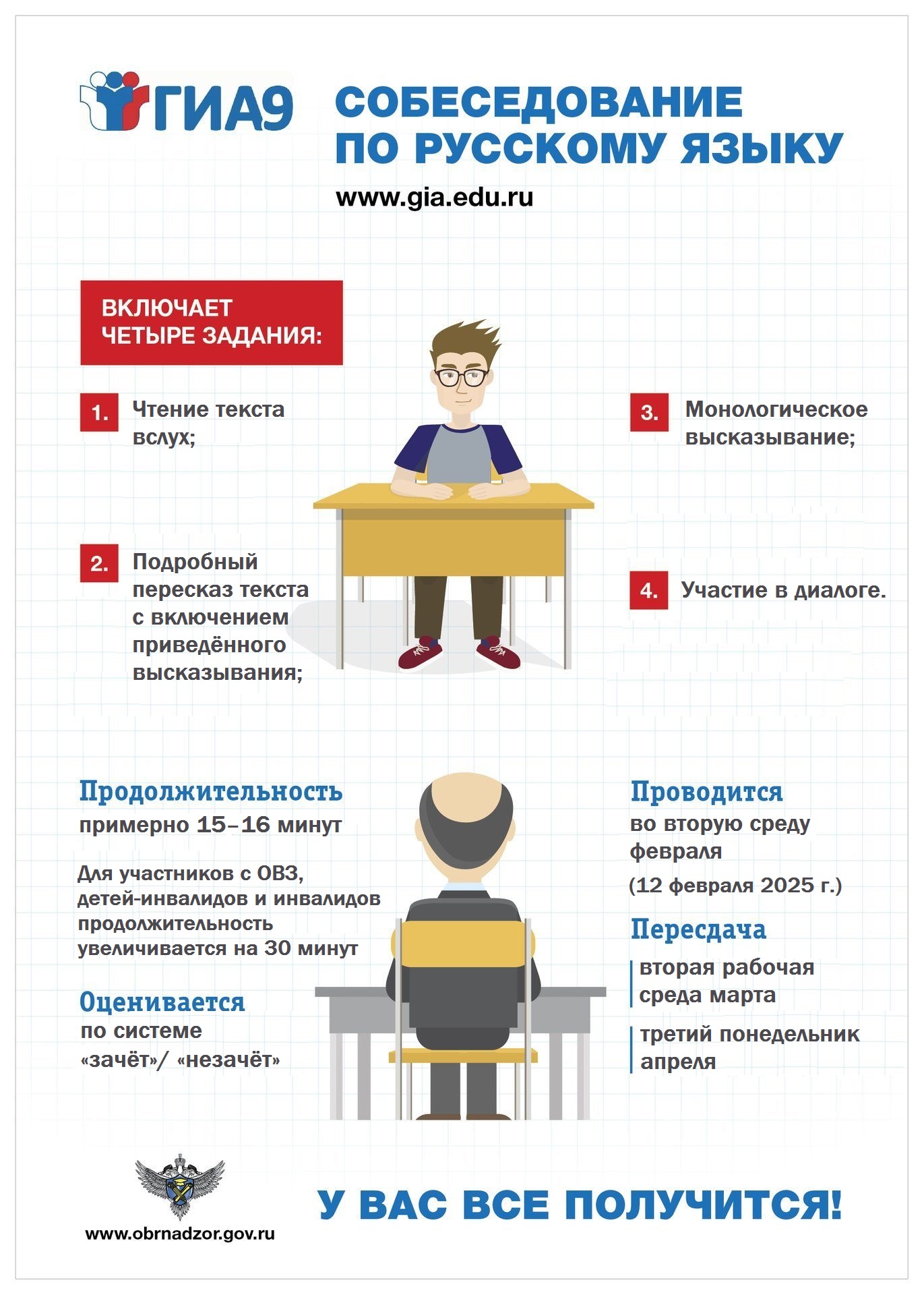 В 2025 году ИТОГОВОЕ СОБЕСЕДОВАНИЕ по русскому языку для выпускников 9 класса пройдет 12 февраля. Результат «Зачет» за итоговое собеседование — это одно из условий допуска к государственной итоговой аттестации. Учащиеся, получившие на собеседовании неудовлетворительный результат («незачет»), или не явившиеся на собеседование по уважительной причине, или не завершившие собеседование по уважительной причине (болезнь или иные обстоятельства) могут пройти итоговое собеседование повторно 12 марта и 21 апреля. Для участия в итоговом собеседовании обучающиеся подают заявление в образовательную организацию, в которой проходят обучение (экстерны — в образовательную организацию по выбору экстерна) не позднее 29 января 2025 года. Для проведения информационно-разъяснительной работы по организации и проведению итогового собеседования просим Вас ознакомиться с содержанием данного раздела сайта. |
